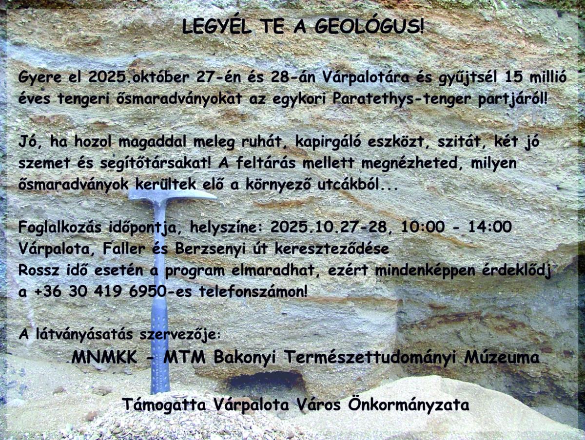 IZGALMAS PROGRAM AZ ŐSZI SZÜNETRE! VÁRPALOTAI LÁTVÁNYÁSATÁSRA VÁRUNK MINDEN ÉRDEKLŐDŐT, KICSIKET ÉS NAGYOKAT EGYARÁNT 2025. OKTÓBER 27-ÉN ÉS 28-ÁN, HÉTFŐN ÉS KEDDEN 10 ÓRÁRA. Címkék: feltáráslátványásatásgeológusősmaradványokősmaradványgyűjtésVárpalotaParatethysgyerekekcsaládokőszi szünetBakonyRovat: Programok